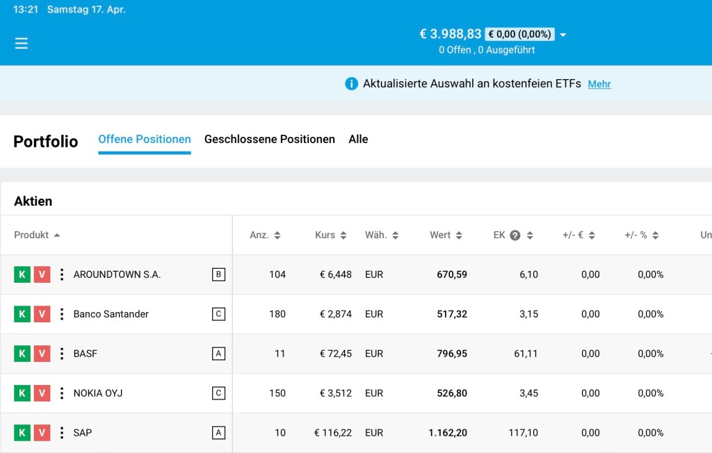 Kurz vor der 4 (4.000) Verfasst vonFinanzblog17. April 2021Veröffentlicht inAllgemein Nach einem Zwischensprint von SAP fehlen nur noch 12 € um erstmalig den Wert von 4.000 zu erreichen. Let‘s Go! Teilen mit: Klicke, um auf X zu teilen (Wird in neuem Fenster geöffnet) X Klick, um auf Facebook zu teilen (Wird in neuem Fenster geöffnet) Facebook Klicken zum Ausdrucken (Wird in neuem Fenster geöffnet) Drucken Klick, um auf LinkedIn zu teilen (Wird in neuem Fenster geöffnet) LinkedIn Klicken, um auf WhatsApp zu teilen (Wird in neuem Fenster geöffnet) WhatsApp Klicken, um einem Freund einen Link per E-Mail zu senden (Wird in neuem Fenster geöffnet) E-Mail Mehr Klicken, um auf Telegram zu teilen (Wird in neuem Fenster geöffnet) Telegram Gefällt mir Wird geladen …