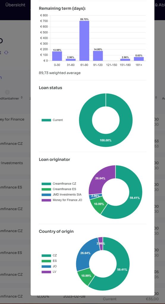 Ein wenig anders gestaltet sich Esketit. Hier ist der Auto-invest nach Konfiguration angelaufen. Allerdings waren hier auch nicht ausreichend Kredite vorhanden, allerdings mehr als bei Peerberry. D.h. hier liegen nur 40 % „blöd“ rum. Ansonsten funktioniert die Automatisierung relativ gut. Relativ deshalb, weil ich keine Höchstgrenze je Investition angeben kann. Somit habe ich beispielsweise 150 € in einen tschechischen Kredit investiert, was mir zu viel ist. Auch hier bleiben ich dran und werde ggf. anpassen.