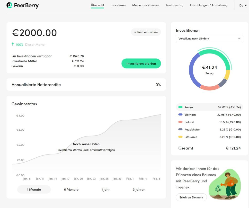 Kommen wir zu Peerberry. Dort ging als nächstes mein Geld ein und auch hier bin ich mit dem Auto-invest rein. Zu meiner Überraschung wurden mir nur eine Handvoll von Krediten angezeigt. Ich habe mir Gedanken gemacht, ob ich seltsame/untypische Einstellungen vorgenommen habe, habe ich aber nicht. Peerberry bietet tatsächlich wenige Kredite an. Das gefällt mir nicht. So habe ich erst einmal, damit ich überhaupt Investitionen habe, manuell investiert. Unschön und damit auch vorbei am Sinn, liegen aktuell über 90 % ungenutzte Geldmittel „blöd“ rum. Ich werde jetzt 1-2 Wochen warten was passiert und ggf. dann umschichten.