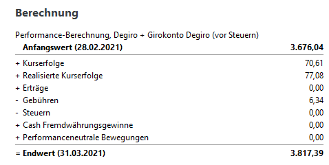 Der März war relativ langweilig. Daher gibt es auch nur diesen Auszug aus meiner Portfoliosoftware. Die Zahlen sind selbst sprechend. Fragen? Gerne her damit.