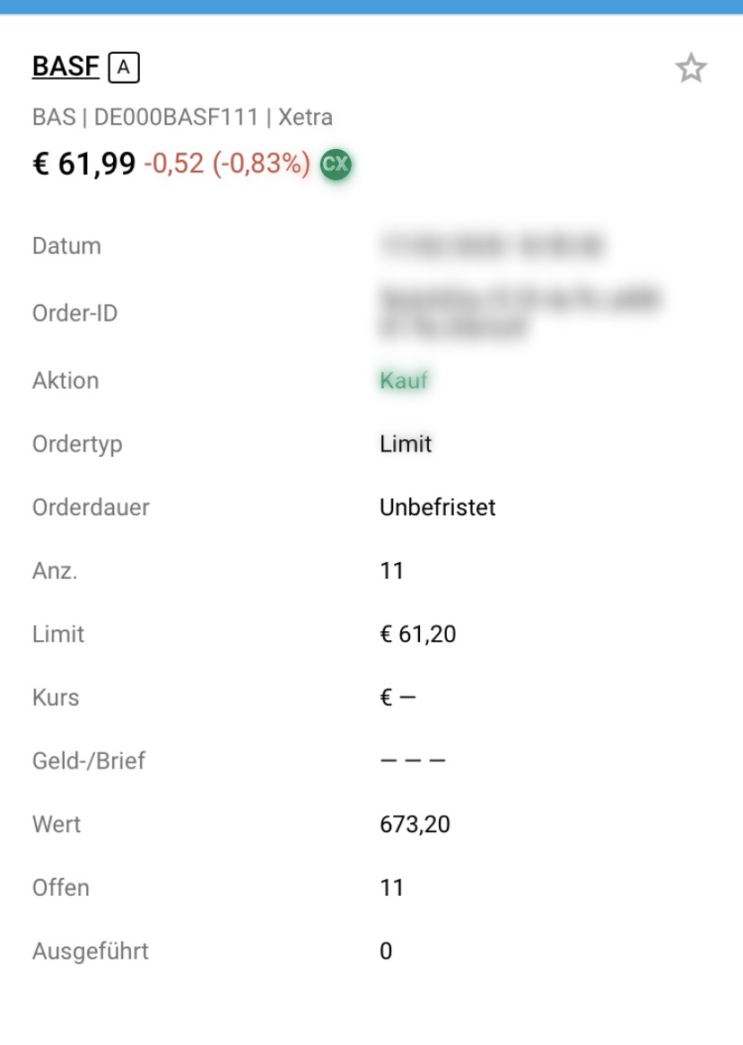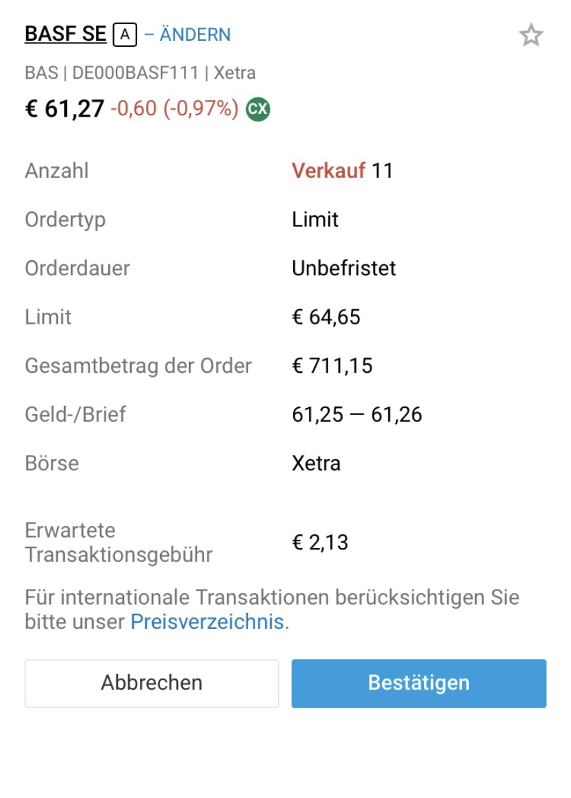 Ich habe mich für BASF entschieden, da sie viel gehandelt wird, dass Unternehmen seit Jahren erfolgreich ist. Und charttechnisch für mich ganz gut aussieht. Gestern Abend den Kaufauftrag gestellt, und …