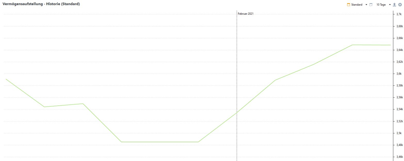 Wie Ihr im 10 Tages-Chart sehen könnt‘, ist der Reddit-Hype scheinbar wieder vorbei und mein Depot ist wieder bei „alter Stärke“. Die Aroundtown – Dividende (14 ct/Aktie) wurde zwischenzeitlich gut geschrieben. Somit liegt das Depot aktuell bei 3.648 €. Aktuell bester Wert: BASF (+9,6 %), schlechtester Wert (Banco Santander -12 %)