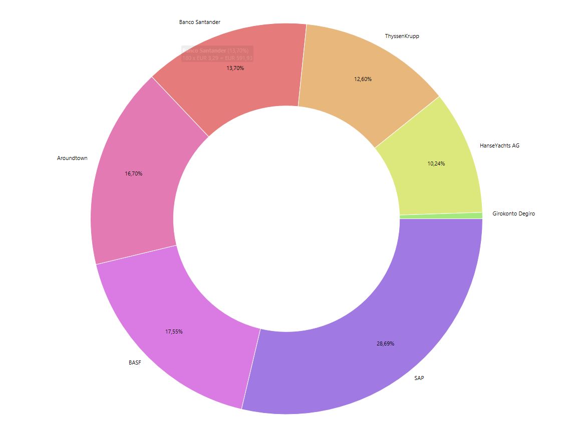 Aktueller Depotwert 4.096€ (+ 31 €). Aroundtown – 8,2 % (von – 10,8 %), Banco Santander – 1,6 % (- 1,0 %), BASF + 10,2 % (+ 9,6 %), home24 – 4,1 % (- 4,5 %), SAP + 4,9 % (+ 4,3 %).